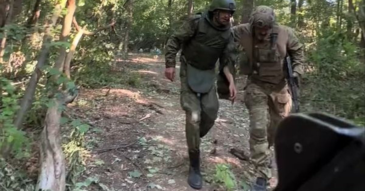 Бойцы ТГр "Угледар" ведут пленного оккупанта по лесной дороге. ВИДЕО