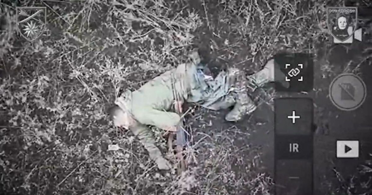 На видео зафиксировано, как один из захватчиков убегает от украинского БПЛА, имея только автомат, однако операторы дронов его догнали и ликвидировали.