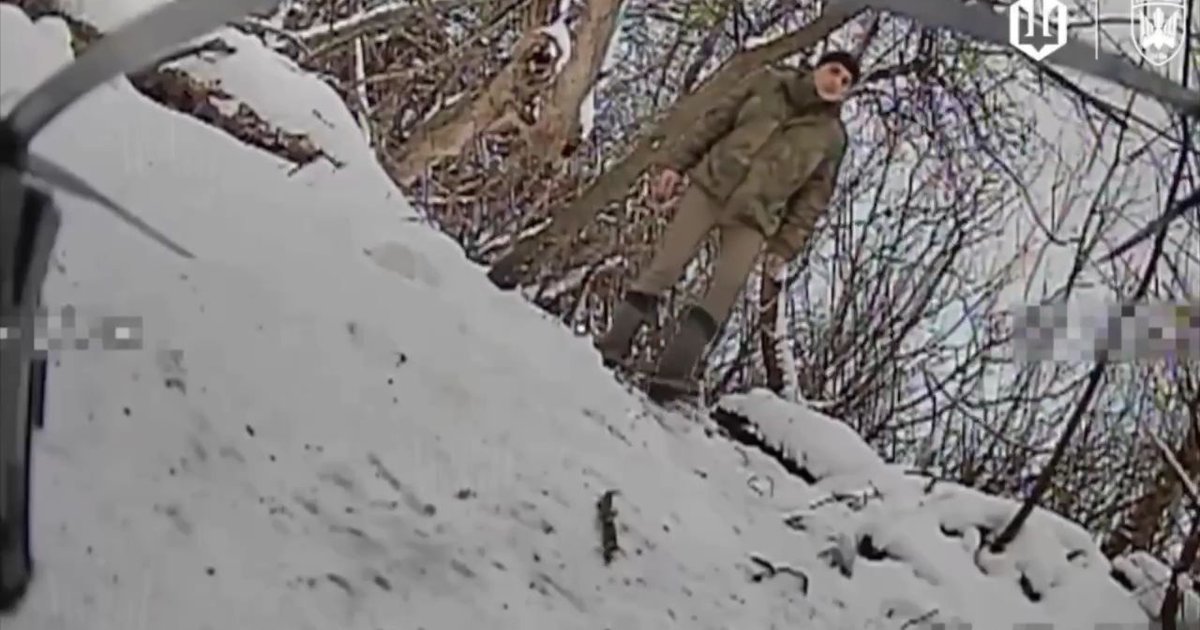Как сообщает Цензор.НЕТ, в сети опубликована видеозапись камеры БПЛА, на которой видно, как россиянин приближается к беспилотнику, а через мгновение изображение исчезает.