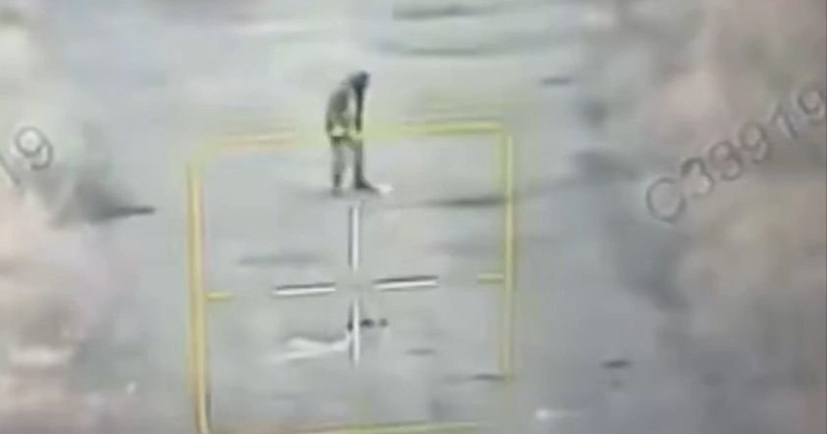 Оккупант пинает ногой предмет на дороге и исчезает в облаке пламени и дыма. ВИДЕО