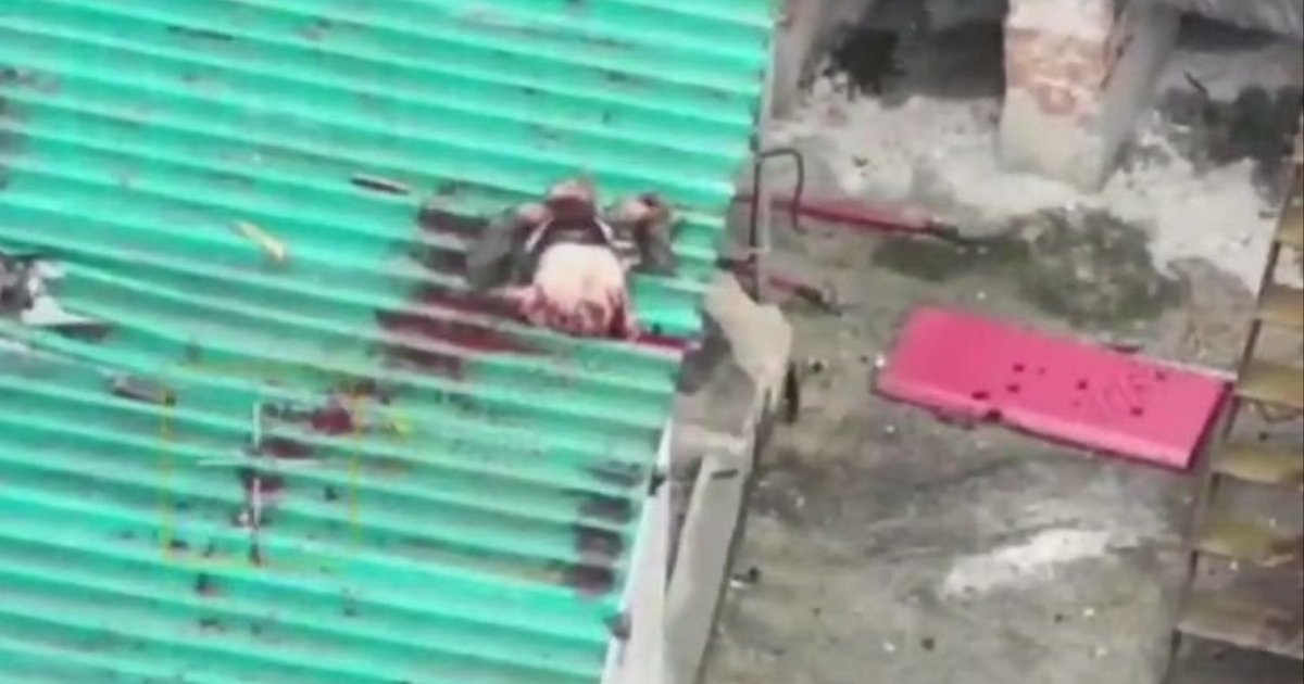 Верхняя часть оккупанта залетела на крышу сарайчика после удара дрона, лежит там и дергается. ВИДЕО 18+