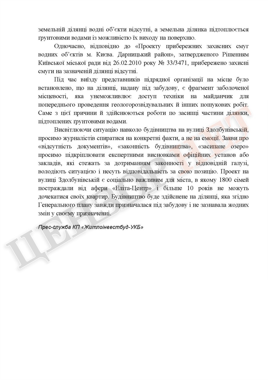 Цензор.НЕТ получил от "Житлоинвестбуд-УКБ" ответ на свой запрос. В нем говорится, что действия фирмы-застройщика на данном участке являются законными. Кроме того, в фирме указывают, что в соответствии с Генпланом Киева, данный участок имеет целевое назначение "многоэтажная жилая застройка".