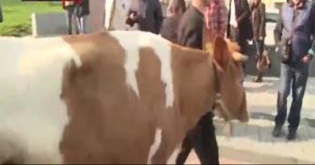 Митингующие привезли в центр Киева трех коров. Животные напуганы, пытаются вырваться.