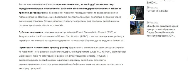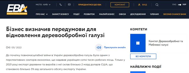 Ще на початку травня Європейська бізнес асоціація (ЕВА), до якої входить більшість деревообробних компаній України, листом звернулась до Прем’єр-міністра України Дениса Шмигаля з проханням розглянути перелік важливих кроків для підтримки деревообробників. З-поміж важливого наголошувалося: з метою мінімізації витрат просимо тимчасово, на період дії воєнного стану, передбачити продаж необробленої деревини вітчизняним деревообробникам також за прямими договорами між державними лісовими господарствами та деревообробними підприємствами. Оскільки, за інформацією експертів Асоціації, реалізація деревини через аукціони на товарних біржах здорожчує вартість деревини для реальних виробників за рахунок аукціонних зборів та платежів.