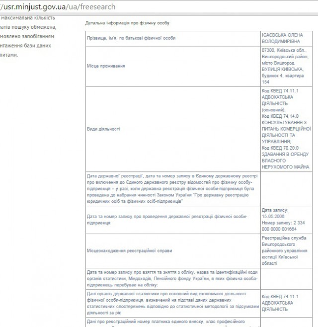 Олена пропала безслідно! Допоміг знайти Олену ії іденитифікаційний код, який, нащастя, не змінюється після зміни призвіща. Її нове призвіще - Ісаєвська Олена Володимирівна, судья скандального Печерського районного суду м.Києва
