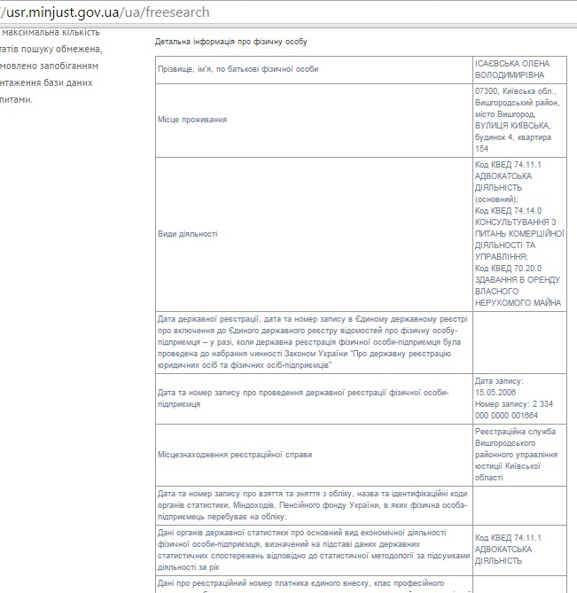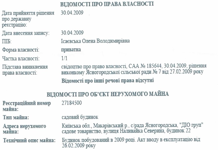 Сама Ісаєвська володіє будинком у кортежному містечку Северинівка, який цікавим способом прихований!По сусідству будинком володіє Портнов Володимир ( тато, пенціонер, який все життя пропрацював водієм). По адресах, які вказані в документах, немає ні вулиці, ні будинку, тільки по кадастровому номеру вдалось побачити де саме знаходяться вказані елітні будинки!