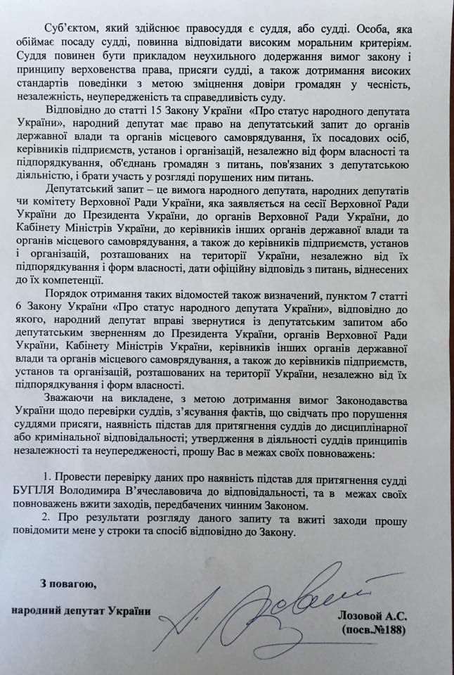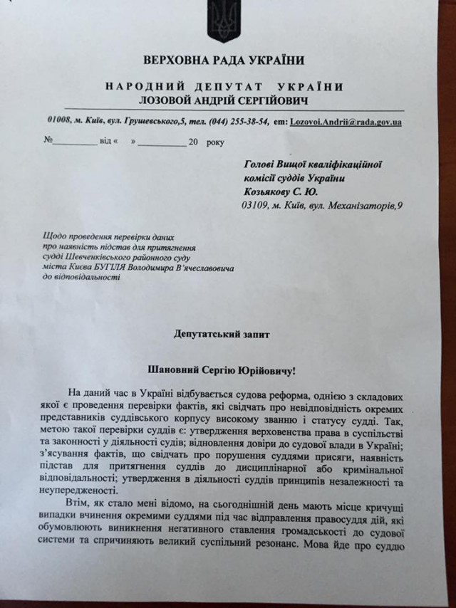 Як і обіцяв на ефірі NewsOne TV, звернувся із депутатським запитом до Голови Вищої кваліфікаційної комісії суддів Сергія Козькова з вимогою провести перевірку судді Володимира Бугіля і притягнути його до відповідальності.