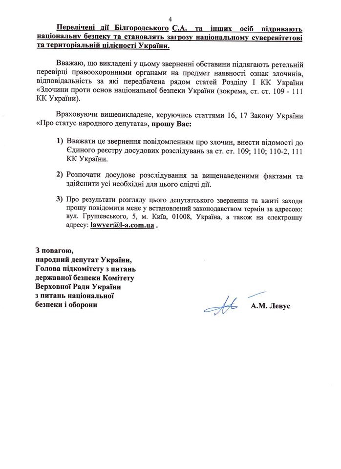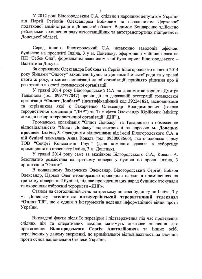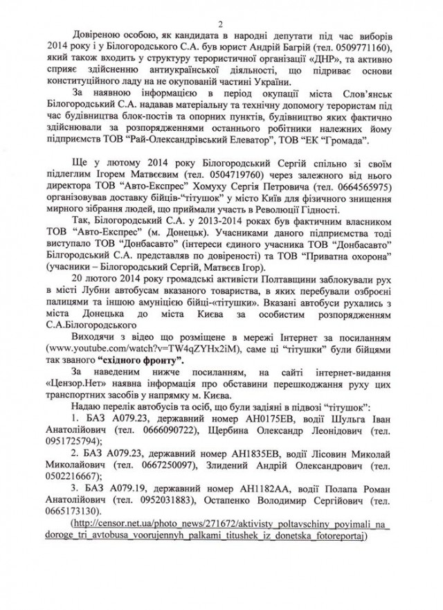 Звернувся до Служби безпеки, Генпрокуратури та Міністерства внутрішніх справ із заявою про злочини Сергія Білогородського і вимогою ретельніше приглянутися до сепаратистської антидержавницької діяльності цієї особи.