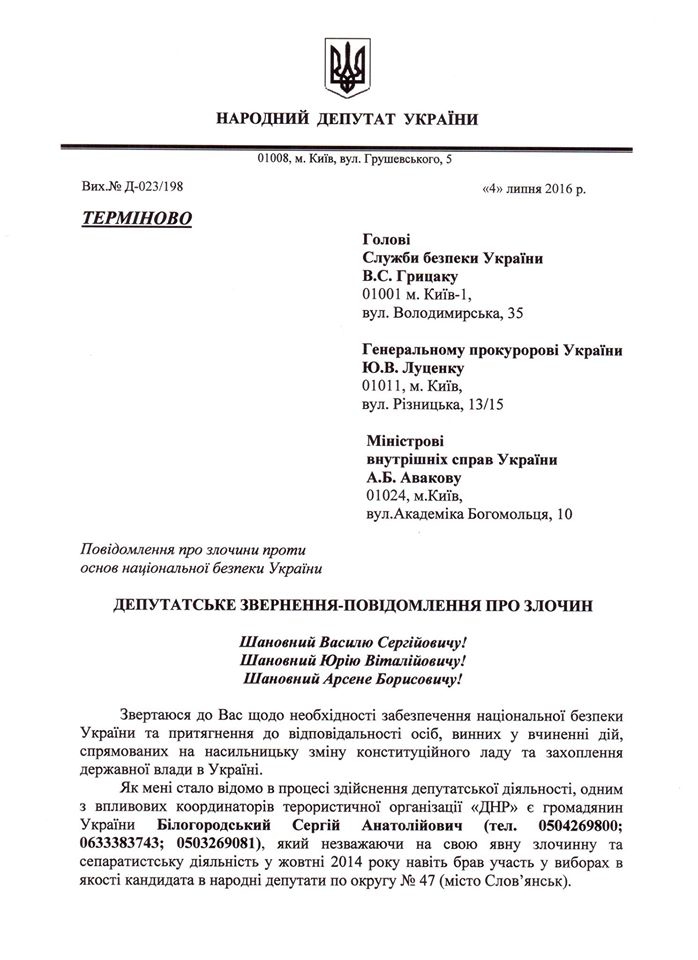 Одже, хочу звернути увагу правоохоронців на викладені факти та негайно розслідувати терористичну діяльність Сергія Білогородського.