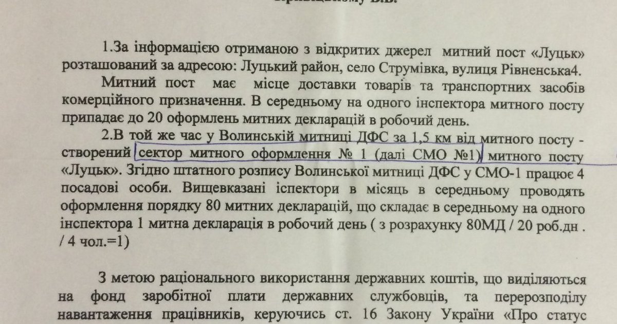 Принаймні, тепер мені зрозуміло, чому моє депутатське звернення досі не розглянуто і навіщо в Луцькому районі за 1,5 км від митного посту створено сектор митного оформлення № 1 (СМО №1).