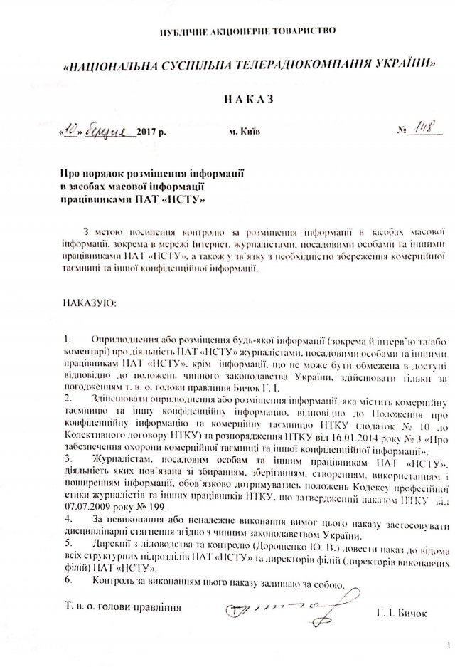 На суспільному мовнику - у Національній суспільній телерадіокомпанії України - сталася безпрецедентна ситуація. Співробітникам затикають рота аби вони не коментували будь-яку інформацію, що пов'язана з діяльність ПАТ «НСТУ». Відповідний наказ видала тимчасово виконуюча обов'язки керівника «Національної суспільної телерадіокомпанії України» Галина Бичок.