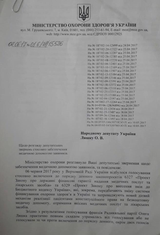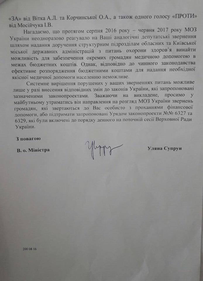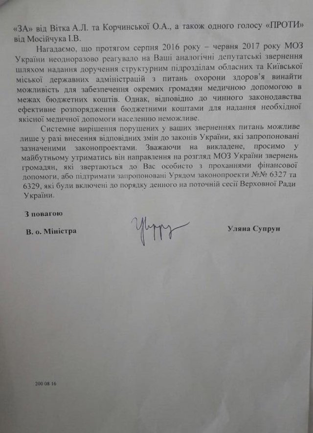 В.о. міністра охорони здоров'я У. Супрун відмовляється розглядати мої звернення про надання допомоги на лікування українських громадян тому, що наша фракція не голосувала за "медичну реформу" влади. Це є помста пані Супрун за нашу політичну позицію! Але страждають від цього самодурства самі нужденні українці. Саме їм очільниця МОЗ - забувши про клятву Гіппократа! - відмовляє у медичній допомозі і лікуванні! У фашистських концтаборах робили так само!!