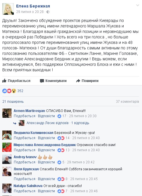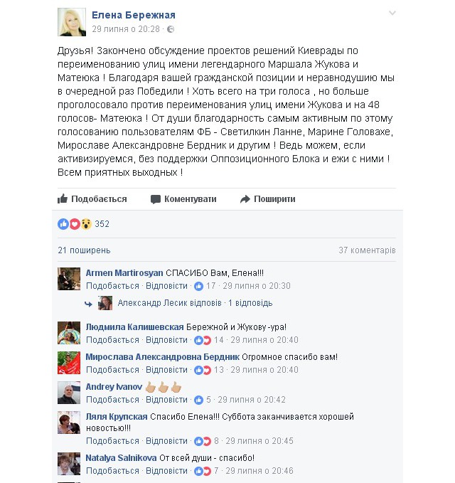 Через прихильників «руского міра» в Києві, які маскуються під «блогерів» та громадських діячів, а також через екс-міністра юстиції часів Януковича Олену Лукаш та Олену Бережну (в 2014-2015 рр. відзначилася неоднозначними висловлюваннями, спрямованими проти української армії), мати екс-нардепа від Партії регіонів Ірини Бережної, було зірвано перейменування вулиці маршала Жукова на вул. Кубанської України, вул. Матеюка (обидві - в Деснянському районі столиці) - на вул. Василя Іваниса (прем'єр-міністра Кубанської Народної Республіки, активного прихильника об'єднання Кубані з Україною), вул. Анрі Барбюса на вул. Василя Тютюнника, провулку Кріпосного на провулок Фортечний.