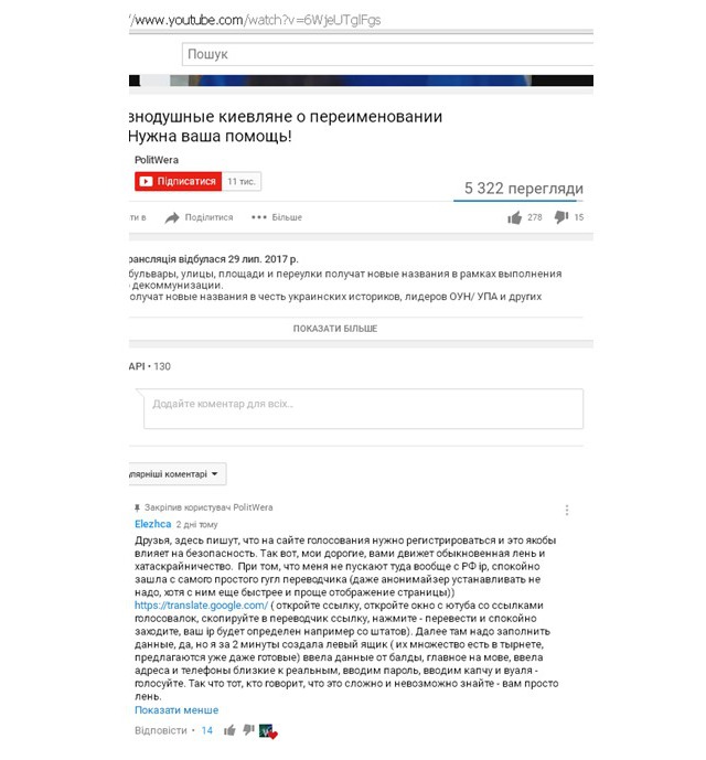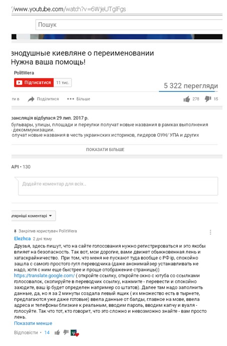 Як свідчать скін-копії переписок в соціальних мережах та з YouTube, декомунізацію зривали й громадяни Росії, які в своїх коментарях під трансляціями, зокрема й проросійської за суттю інтернет-програми PolitWera, детально розповідали, як треба реєструватися, щоб голосувати з території Росії.