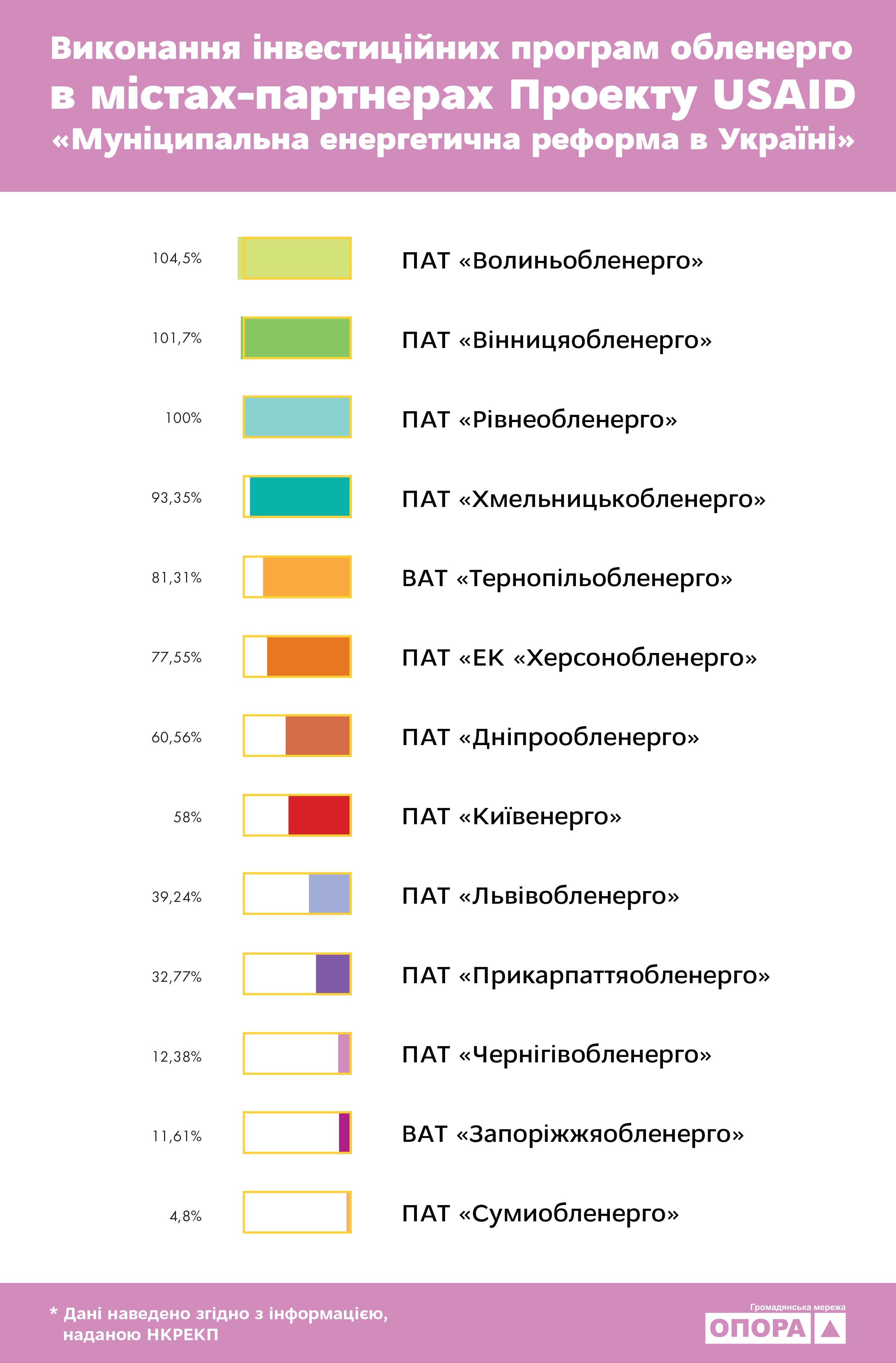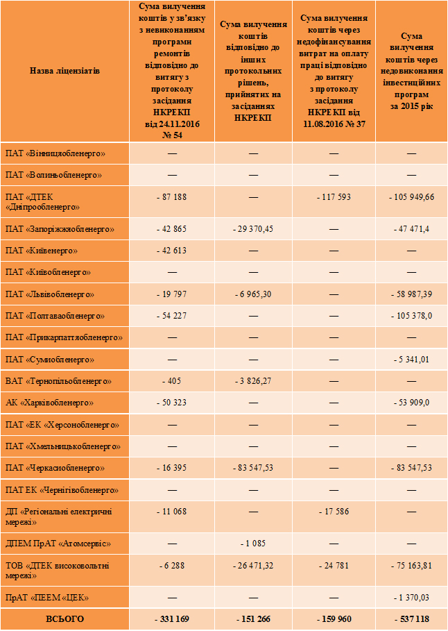 Як видно з аналізу ОПОРИ, не всі енергокомпанії виконали свої інвестиційні програми в повному обсязі. У результаті перевірок НКРЕКП запропонувала деяким з обленерго вилучити зі структури тарифу кошти за невиконання інвестпрограм.