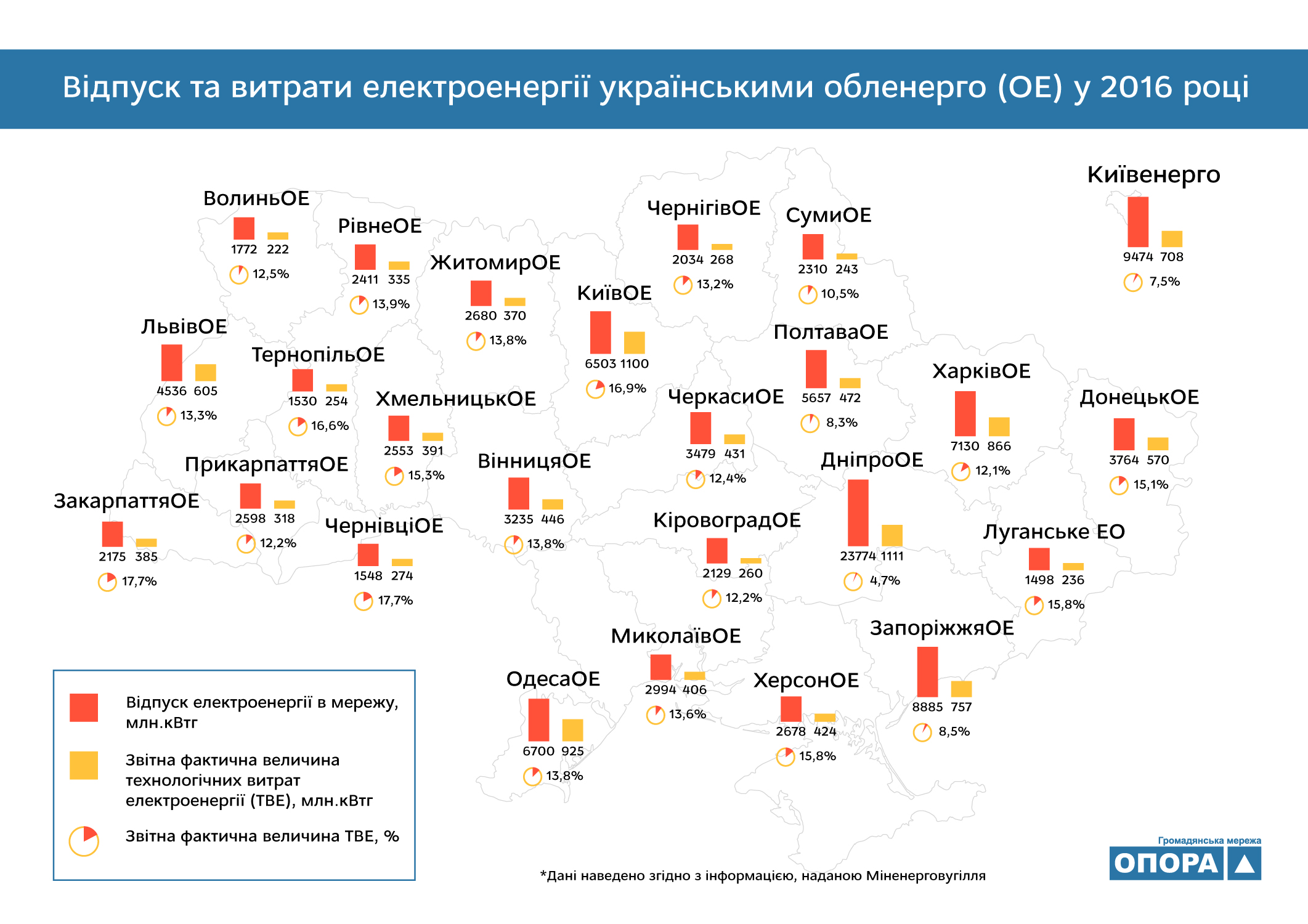 Наприкінці січня Міністерство енергетики та вугільної промисловості опублікувало на сайті інформацію щодо технологічних витрат електроенергії (ТВЕ) на передачу електричними мережами. Громадянська мережа ОПОРА вирішила проаналізувати, про що свідчать ключові показники обленерго, оприлюднені міністерством.