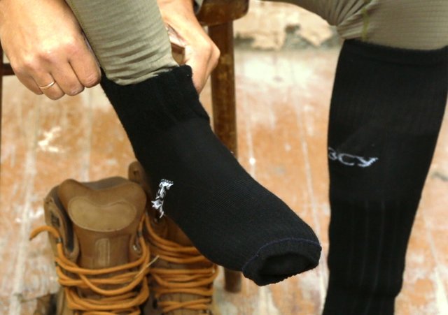 6. Носки должны быть зимними треккинговыми с длинным паголенком. Если нет штатных треккинговых носков ВСУ, рекомендую отечественную ТМ «Треккинг» с бюджетной линейкой треккинговых носков. Борт носков должен на 3 см и более выступать над берцем сапог. Чем длиннее носок, тем лучше.При этом, носки должны надеваться всегда поверх термобелья.