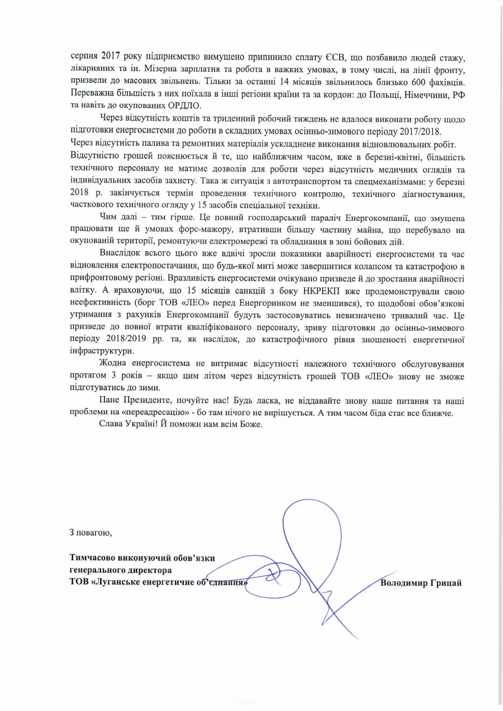 Вже багато місяців ми безкінечно звертаємось до Вас, але у відповідь маємо лише відписки та «переадресацію». Хоча катастрофа стає все ближчою та незворотною. То ж знову просимо Вас, Петро Олексійовичу, зверніть увагу на те, що відбувається, допоможіть відвернути енергетичний колапс! Для цього треба не так багато – просто дати можливість ТОВ «ЛЕО» працювати: зняти арешт з рахунків, відмінити/пом’якшити санкції НКРЕКП. Це поверне луганським енергетикам п’ятиденний робочий тиждень, нормальну зарплатню, дасть можливість придбати паливо та ремонтні матеріали, пройти медогляди персоналу та техконтроль спецтехніки, забезпечить людей індивідуальними засобами захисту.