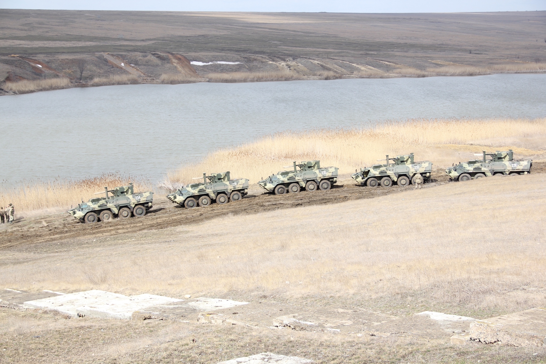 На 235-му Міжвидовому центрі підготовки частин та підрозділів ОК «Південь» Сухопутних військ Збройних Сил України «Широкий лан», що на Миколаївщині, відбулося практичне випробування нових БТР-4Е на подолання водних перешкод.