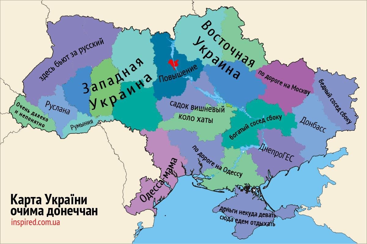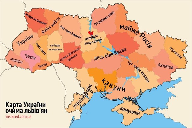 На представлених картах України продемонстровані результати дослідження, проведені у 2013 році ще до останньої нашої Революції гідності моїм колегою – дослідником Анатолієм Ткачуком на підставі соціологічних досліджень про вітчизняні стереотипи. Людей з різних регіонів України запитували “як з Вашої точки зору живуть люди на тій чи іншій території країни? Хоч це опитування доволі іронічне, але воно показує, що на той час, а саме у 2013 році усвідомлення себе як єдиних українців зі знанням своєї країни досі не відбулися. І це справді є наслідком колонізації, яка відбулася упродовж великої кількості років. Що мене лякає особисто у цій колонізації? - Коли я припинив бути журналістом і почав займатися політикою – мене вразило і продовжує вражати і зараз те, що до Майдану статус постколоніальної України фактично зберігався. Кожний український чиновник прагнув отримати підтримку для того, щоб по суті керувати цією територією, яка не мала своєї глибокої ідентифікації і очевидно, що така влада гауляйтерів зацікавлена у цій ідентифікації, тому що керувати цими територіями було набагато складніше.