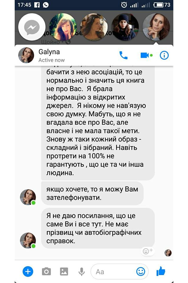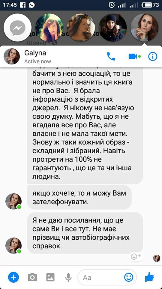 … я прочитала повідомлення у месенджері. Повідомлення було від Галини Сліпушко https://www.facebook.com/galaslipushko, далі Анна Шила (літературний псевдонім):