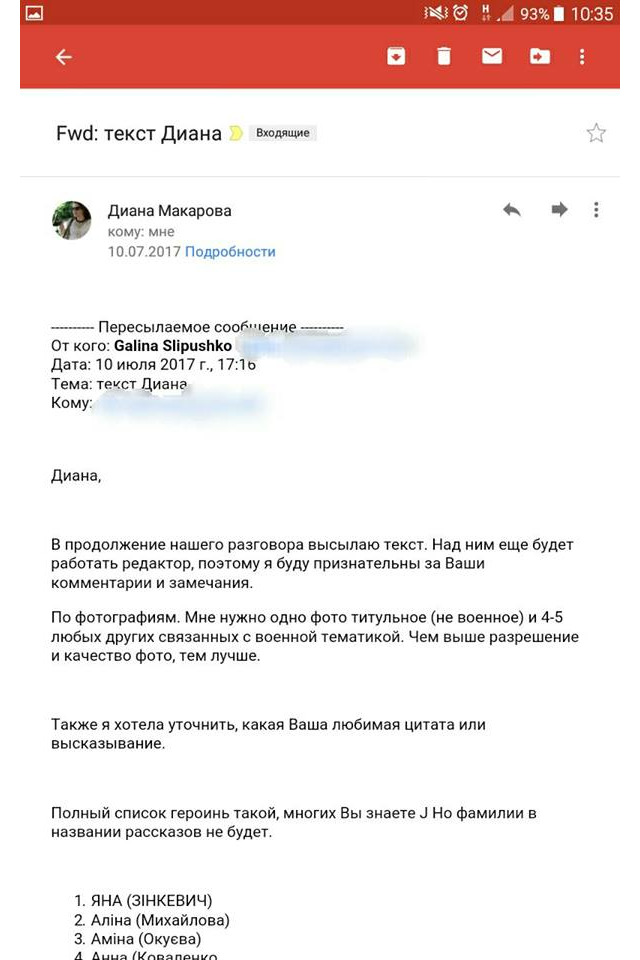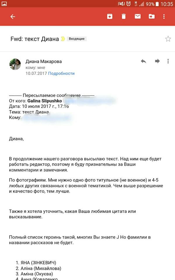 «Диана, добрый день! Меня зовут Галина. Я написала и готовлю к издательству книгу об украинских женщинах, принимающих участие в АТО. Так получилось, что Вы и Ваша истоия меня очень вдохновила. И я написала о Вас целый расссказ. Я хотела бы попросить несколько Ваших фото для книги, если вы не против!! Заранее спасибо!»