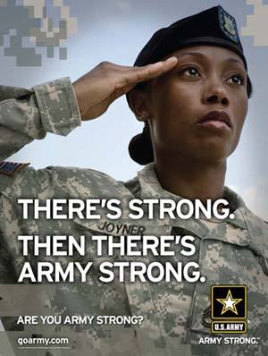 Современный слоган. Удобен тем, что может обыгрываться в различных словосочетаниях. Подчеркивается главная мотивация бойца, который идет в армию - стать сильным. Во всех смыслах. На плакате женщина-афроамериканка - и она одев эту форму может стать сильной. Смысл - армия учит быть сильным, армия - это пример силы, это воспитание силы. Вариантов много, но твою базовую потребность военные психологи уже выявили. Все это подчеркивает изменение концепции - ранее предыдущие три слогана говорили о том, что армия даст возможность стать кем ты хочешь. А сейчас вариантов выбора нет - конкретика прямая и лобовая - мы знаем, ты идешь в армию, чтобы стать сильным, ведь армия - это главная сила, и ты гарантированно станешь частью этой силы.