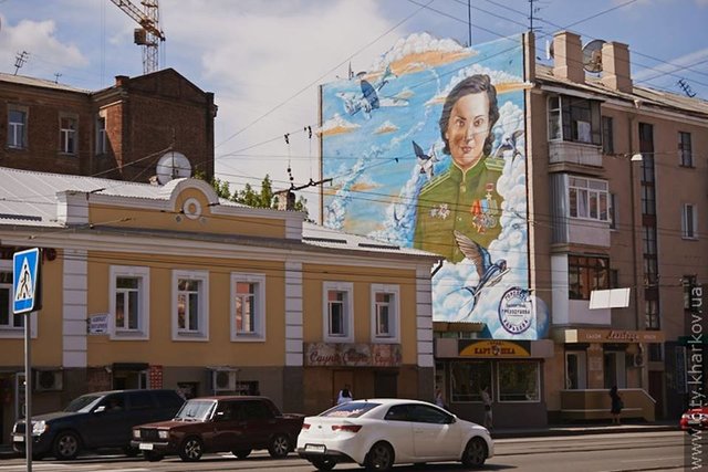 Наостанок — про головне фото. Це мурал у Харкові із зображенням Валентини Гризодубової — льотчиці часів Другої світової, яка народилася в цьому місті. Вона навряд з’явиться на сторінці Інституту нацпам’яті, бо не вкладається у цілі та завдання відомства. Я і не наполягаю, просто інформую.