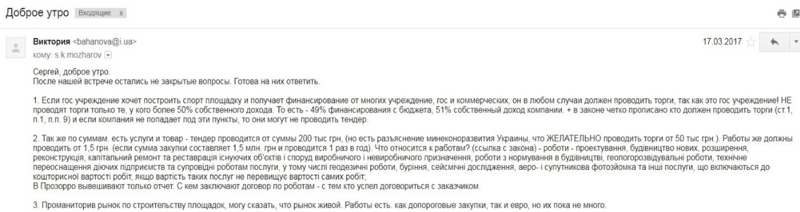 Спершу, вона надіслала Терещуку документ, із сумами закупівлі матеріалу в "Спорт Технології" та контактами вищезазначених підрядників.