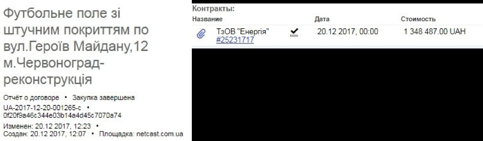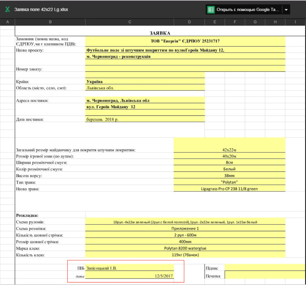 Вже тоді було відомо, не лише хто переможе на дерджавних тендерах, а навіть в кого будуть купувати штучну траву замовники. Звісно ж, у ТОВ "Спорт Технологія". Фактично, заявка на закупівлю покриття у "Спорт Технологій" була сформована ще у травні, де тендерами і не пахло. На практиці, підприємство – ТОВ "Енергія" (яке зазначено у заявці) перемогло у тендері. Але, не в травні, коли була заповнена заявка, а аж у грудні. Надіславши ЗА ДЕНЬ до своєї перемоги, заявку на закупівлю покриття.
