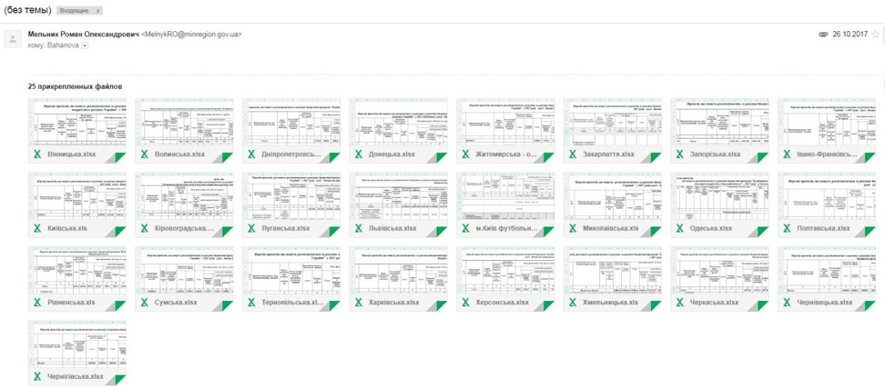 А вже 26 жовтня головний спеціаліст відділу з питань взаємодії з органами влади та аналітичної роботи міністерства Роман Мельник надіслав Бахановій детальний звіт щодо доцільності реалізації проекту в кожному регіоні України.
