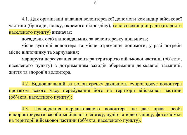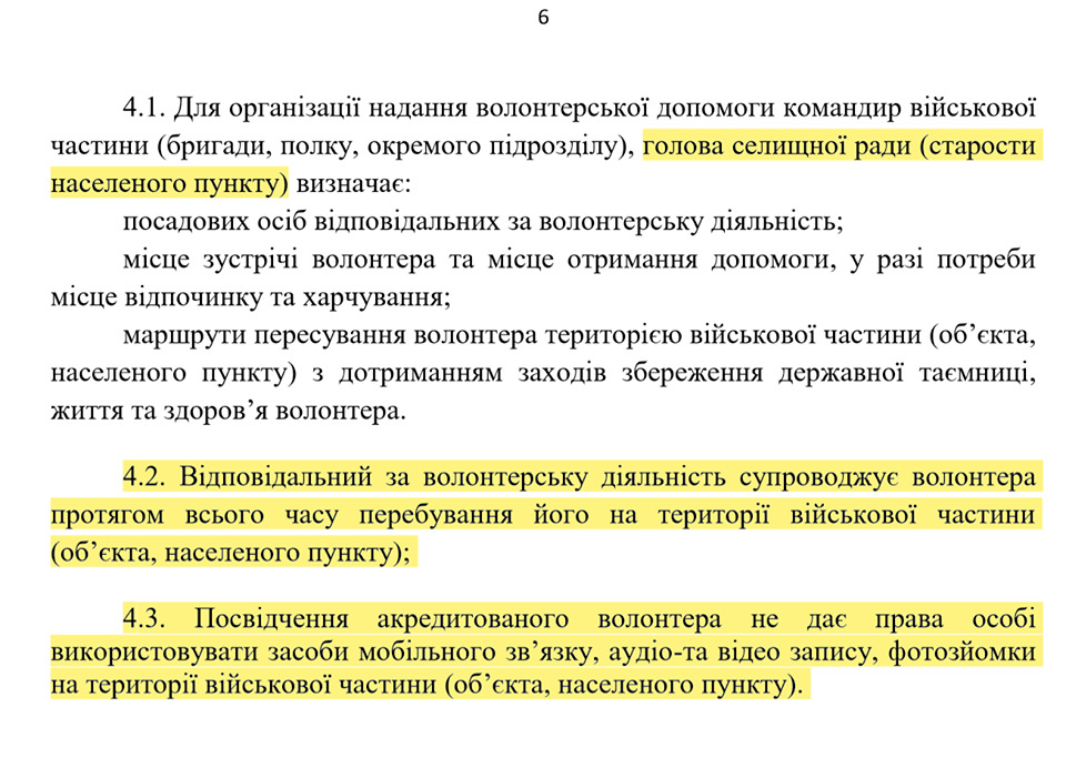 4.3 Посвідчення акредитованого волонтера не дає права особі використовувати засоби мобільного зв'язку, аудіо- та відео запису, фотозйомки на території військової частини (об'єкта, населеного пункту).
