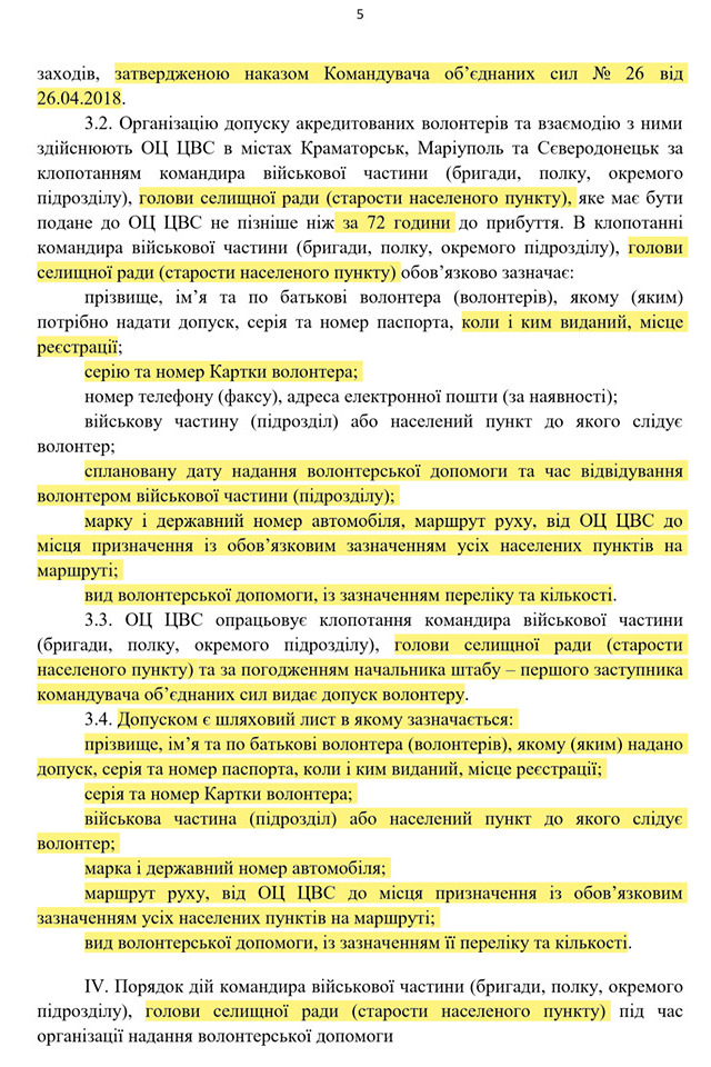 8. Пункт 6. 3.2. Організацію допуску акредитованих волонтерів та взаємодію з ними здійснюють ОЦ ЦВС в містах Краматорськ, Маріуполь, Сєверодонецьк за клопотанням командира військової частини (бригади, полку, окремого підрозділу), голови селищної ради (старости населеного пункту), яке має бути подане до ОЦ ЦВС не пізніше ніж за 72 години до прибуття. В клопотанні командира військової частини (бригади, полку, окремого підрозділу), голови селищної ради (старости населеного пункту) обов'язково зазначає: - прізвище, ім'я та по батькові волонтера (волонтерів), якому (яким) потрібно надати допуск, серія та номер паспорта, коли і ким виданий, місце реєстрації; - серію та номер Картки волонтера; - номер телефону (факсу), адреса електронної пошти (за наявності); - військову частину (підрозділ) або населений пункт до якого слідує волонтер; - сплановану дату надання волонтерської допомоги та час відвідування волонтером військової частини (підрозділу); - марку і державний номер автомобіля, маршрут руху, від ОЦ ЦВС до місця призначення із обов'язковим зазначенням усіх населених пунктів на маршруті; - вид волонтерської допомоги, із зазначенням переліку та кількості;