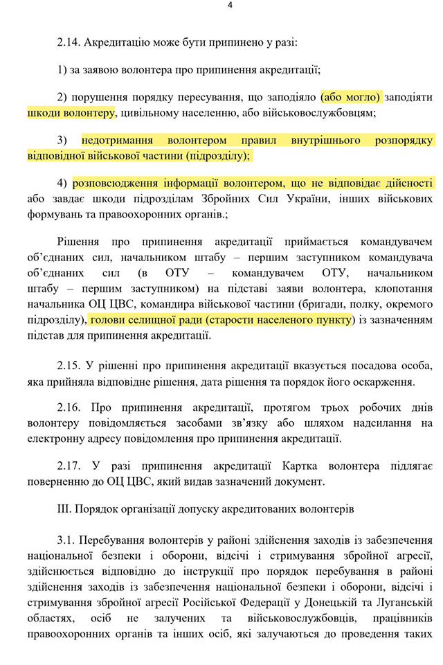 7. Пункт 2.14. Акредитацію може бути припинено у разі: 1) за заявою волонтера про припинення акредитації; 2) порушення порядку пересування, що заподіяло (або могло) заподіяти шкоди волонтеру, цивільному населенню, або військовослужбовцям; 3) недотримання волонтером правил внутрішнього розпорядку відповідної військової частини (підрозділу); 4) розповсюдження інформації волонтером, що не відповідає дійсності або завдає шкоди підрозділам Збройних Сил України, інших військових формувань та правоохоронних органів; Рішення при припинення акредитації приймається командувачем об'єднаних сил, начальником штабу - першим заступником командувача об'єднаних сил (в ОТУ - командувачем ОТУ, начальником штабу - першим заступником) на підставі заяви волонтера, клопотання начальника ОЦ ЦВС, командира військової частини (бригади, полку, окремого підрозділу), голови селищної ради (старости населеного пункту) із зазначенням підстав для припинення акредитації.