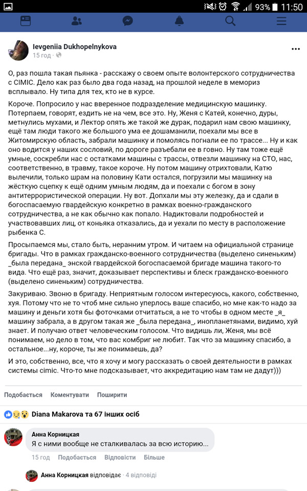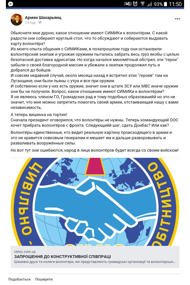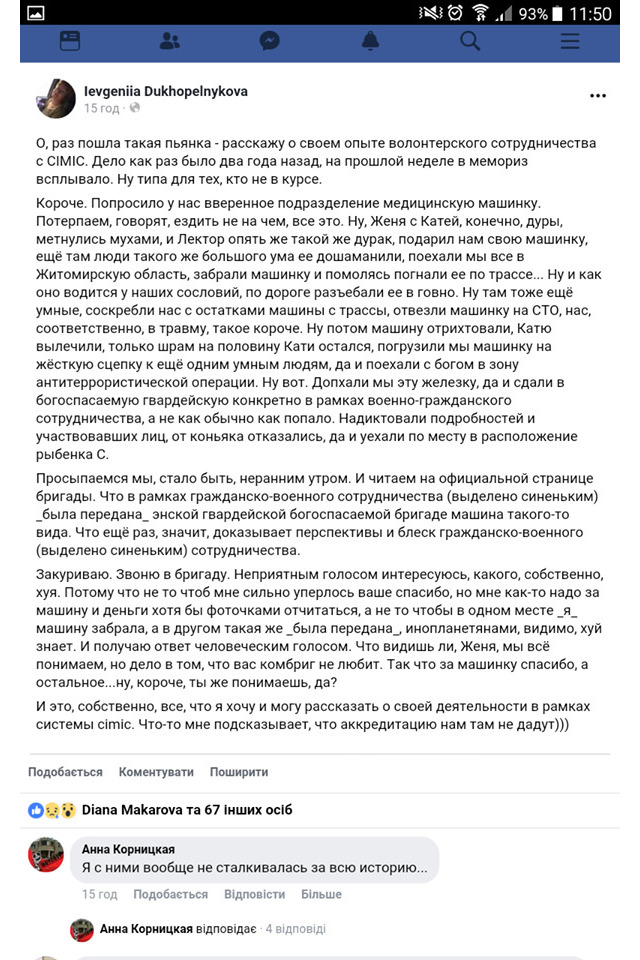 8. Треба віддати належне, деякі інші офіцери CIMIC продовжували осознано вести роботу до репутаційних втрат – від неприхованого боягузства до приписування CIMICам волонтерської роботи (цим грішили особливо часто), приклади - https://www.facebook.com/jane.dukh.3/posts/1997627246943492