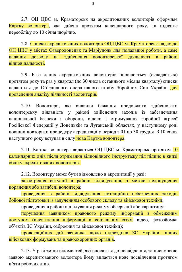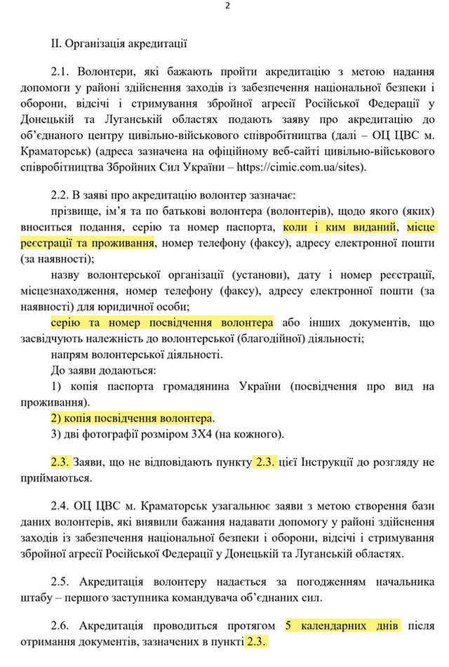 3. Пункт 2.8 Списки акредитованих волонтерів ОЦ ЦВС м. Краматорськ надає до ОЦ ЦВС у містах Сєверодонецьк та Маріуполь для подальшої роботи, а саме надання дозволу на здійснення волонтерської діяльності в районі відповідальності.ПРИКЛАДИ