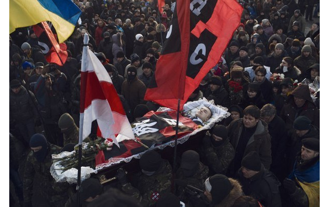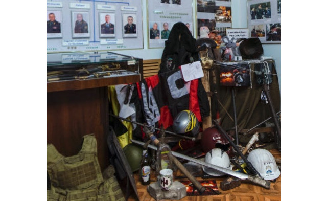 Одночасно поруч, в купі на підлозі – екіпірування учасників революції Гідності серед яких проглядається закопчений стяг УНА-УНСО.