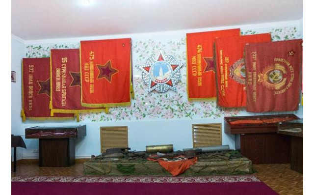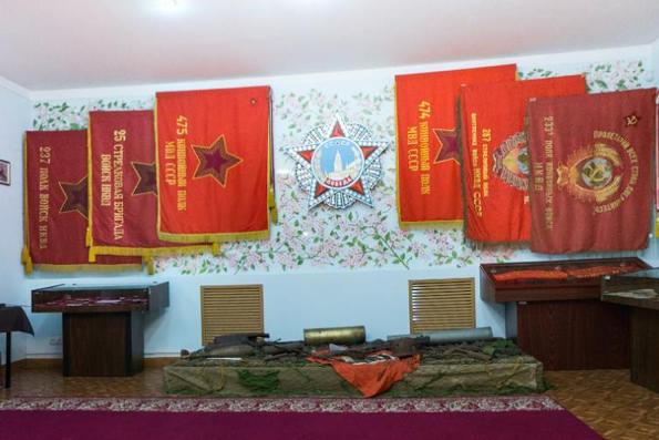Всюди пафосно розставлені прапори конвойних частин НКВС, МГБ, МВС СРСР. Під склом нагородна зброя комуняцьких катів з надписами на кшталт «так служилі наші дєди».