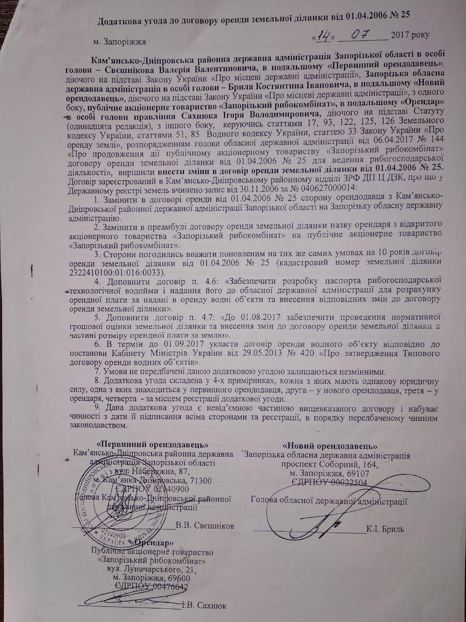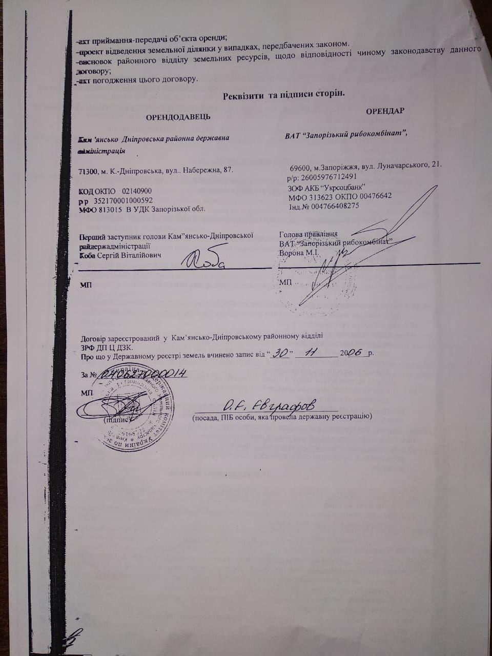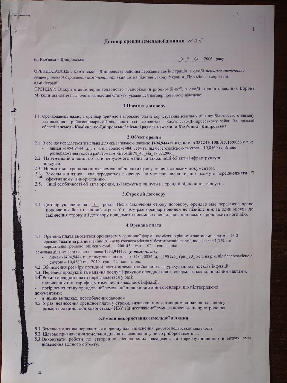 Началась эта любопытная история 1 апреля 2006 года, когда Каменско-Днепровская РГА передала в аренду тогда еще ПАО "Запорожский рыбокомбинат" 3 земельных участка общей площадью 1639,5 га: