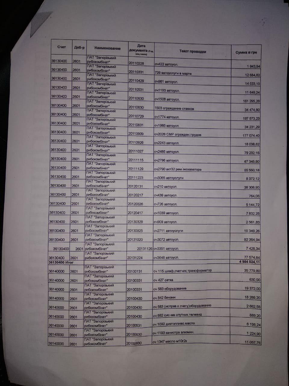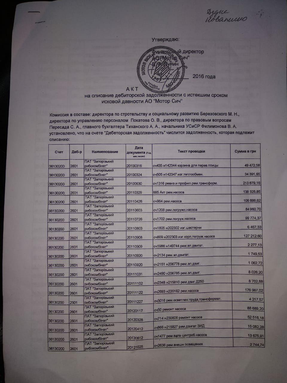 Согласно акту о списании дебиторской задолженности с истекшим сроком исковой давности АО "Мотор Сич", промышленный гигант регулярно оказывал своей "дочке" услуги по ремонту и замене техники, поставлял запчасти, проводил работы по обустройству инфраструктуры и так далее. В период с 2010 по 2013 год было предоставлено услуг на сумму 6,4 миллиона гривен. На бумаге. По факту же – ничего из перечисленного сделано не было. То есть, эти деньги просто прикарманили, списав затем, как убыток предприятия.