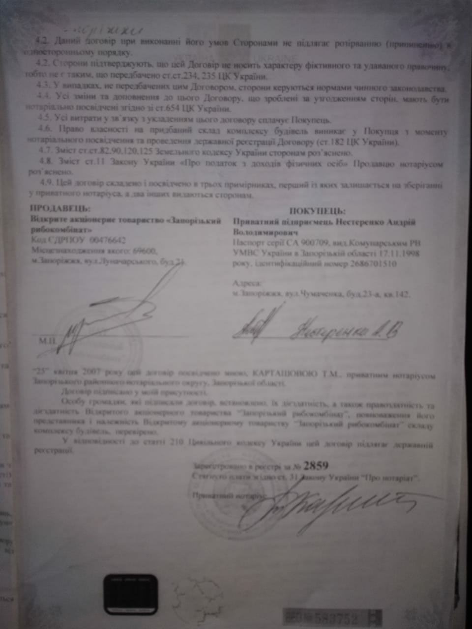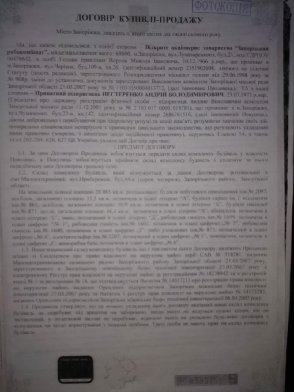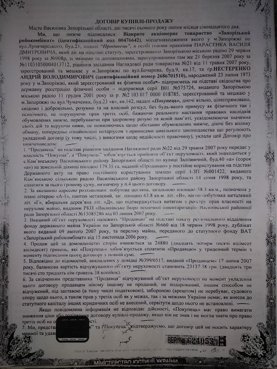 Немногим позже Нестеренко купит у "Запорожского рыбокомбината" рыборазводный участок с водоемом площадью 200 га. И заплатит за все это чуть больше 23 тысяч гривен. Инициатором и организатором этой сделки был Олимпий Покатов – тогда председатель наблюдательного совета "Запорожского рыбокомбината" (решение Наблюдательного совета №22 от 29.06.2007). Вскоре, этот участок также будет перепродан "Агро-Р".