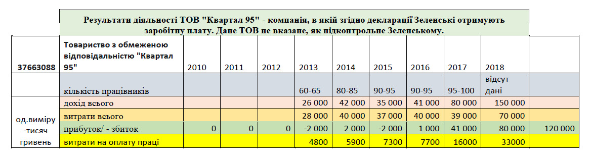 Аналіз саме цього ТОВ "Квартал 95" (ЄДРПОУ 37663088) показав, що воно проводить комерційну діяльність в Україні, має сталий штат працівників до 100 осіб, пристойні прибутки в 2017-2018 роках , всього 120 мільйонів гривень за весь час роботи, сплачує податки. Але воно не є і не може бути іншим джерелом доходу Зеленських , окрім виплати заробітної плати. Тай й можливість сплачувати такі значні суми зарплати була у компанії виключно в останній 2018 рік, до того ТОВ "Квартал 95" коливалась між незначними прибутками та збитками, а обороти були в рази менші. Зеленськім, щоб заробити 13 мільйонів доларів при таких сталих заробітках, знадобилось би 44 роки.