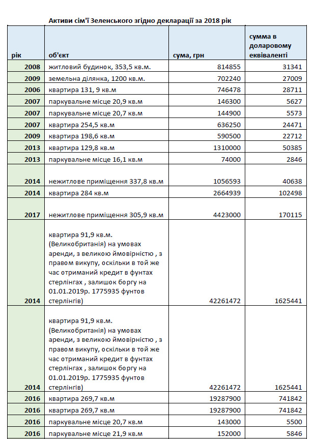 Отже, згідно декларації за 2018 рік , нам стало відомо, що Володимир Зеленський станом на 1 січня 2019 року володіє такими активами (фото 1), в перерахунку на дату придбання на загальну суму близько 16,2 мільйонів доларів США. Для розрахунку я використовувала середні курси в роки, коли відбувалось придбання активу. Але це не суттєво для розуміння масштабу потрясіння, яке на мене чекало в фіналі аналізу. Цікаво, що найбільша сума покупок і накопичень були здійснені у період з 2014 по 2018 роки. На 15,5 мільйонів доларів (як мінімум) сім’я Зеленського поповнила свої активи за час війни України з Росією.