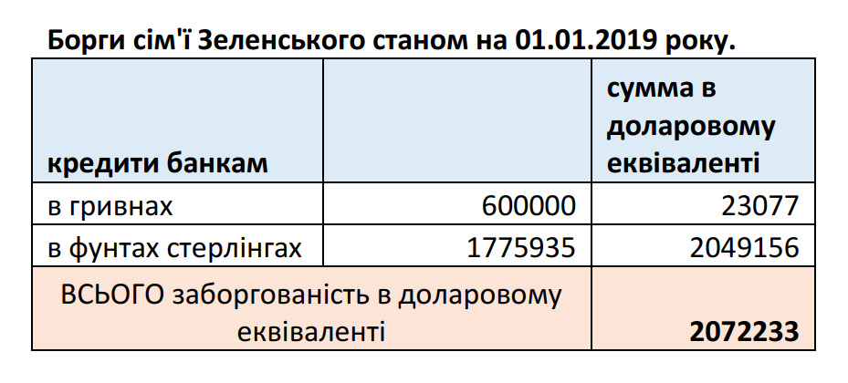 Заради справедливості варто звернути увагу на те, що у Зеленських є кредити на загальну суму 2,1 мільйони доларів США (в еквіваленті) – (фото 2). Перерахунок здійснювала по актуальним курсам на 2019 рік, рік подачі декларації. Левова доля цих кредитів, схоже, була направлена на купівлю елітної нерухомості у Великобританії в 2014 році. Достеменно зрозуміти з декларації це складно, але судячи з того, що квартири вказані у якості активу, але в статусі оренди, можна припустити, що у власність Зеленським вони перейдуть після повної виплати кредиту. Звичайна практика для Великобританії і інших країн Європи та постколоніального впливу Англії.