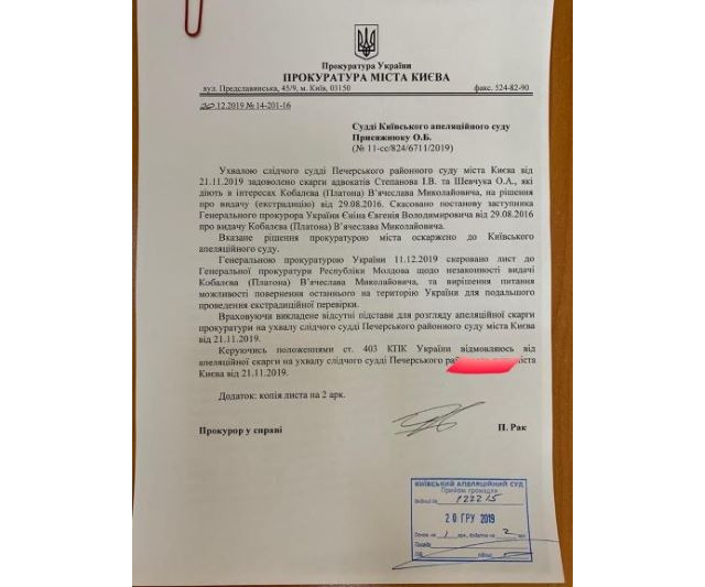 При чому, увага!!! Генпрокурор Рябошапка так поспішає звільнити Платона, що забуває про апеляцію, тобто пише в Молдову ще до вступу рішення суду в законну силу.