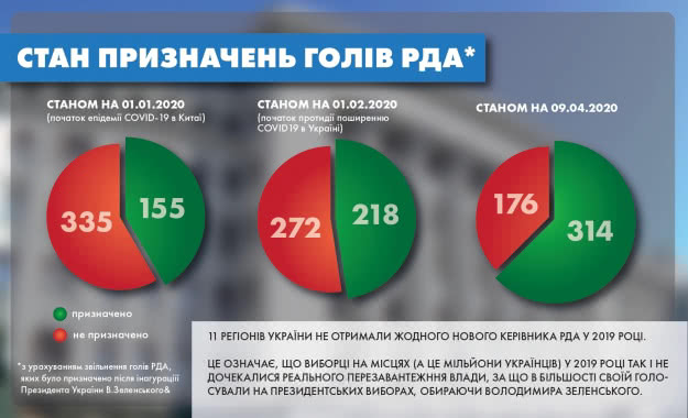 У лютому було призначено 57 голів РДА – і таким чином в епідемію Україна увійшла з 272 головами райдержадміністрацій. Але келих наполовину порожній, ви же це пам'ятаєте, тому в епідемію ми увійшли з відсутністю повноцінно призначених 218 голів РДА та 123 головами РДА, які пропрацювали на своїх посадах не більше місяця часу.