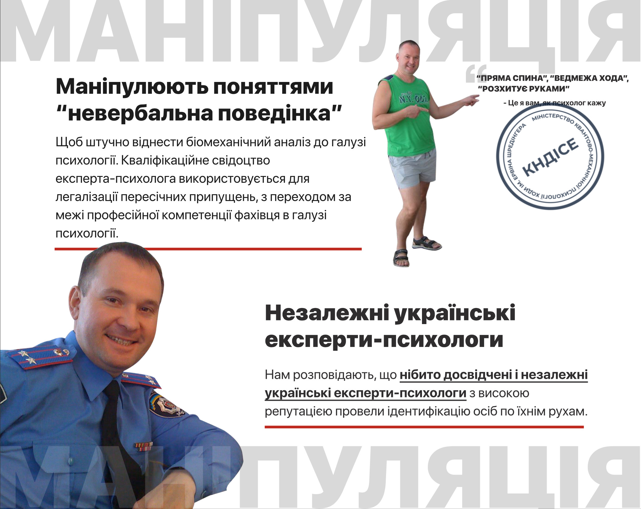 ✅Про психологічну експертизу — це неправда. Не було ніякої психологічної експертизи невербальної поведінки. Було вкрай грубе пересічне порівняння ходи, яке здійснили працівники КНДІСЕ, не маючи на це ані методик, ані хисту, ані наукових робіт в цій галузі. Оскільки вони є психологами, для легалізації своїх досліджень вони назвали ходу “невербальною поведінкою”. З таким успіхом вони могли б, наприклад, судити футбольні матчі — поведінка гравців на полі теж в основному невербальна.