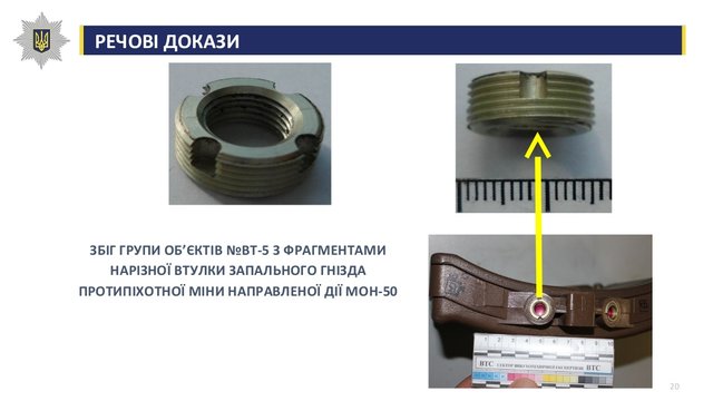 ✅Встановлено лише один елемент, який вирогідно походить від промислово виготовленої міни - це металева нарізна втулка запального гнізда для вкручування туди детонатора або уніфікованого запалу (див. малюнок). Але такі ж саме втулки використовуються для вкручування детонаторів в інших пристроях, зокрема МОН-90. Міна МОН-50 просто є більш розповсюдженою і ймовірно єдиною знайомою експертам, які робили висновок.
