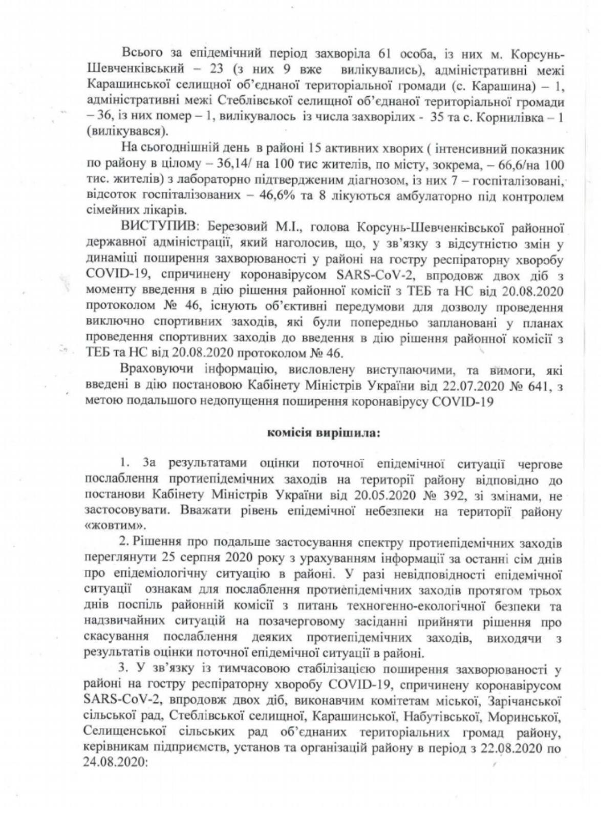 А.Стріхарський надіслав протокол районної комісії ТЕБНС від 22серпня, який, каже, отримав від голови РДА М.Березового. Цитата з документа: "У зв’язку з тимчасовою стабілізацією поширення захворюваності у районі… дозволити проведення спортивних заходів, запланованих до введення в дію рішення комісії ТЕБ та НС за протоколом №46 від 20 серпня 2020 р.", але під відповідальність організатора.
