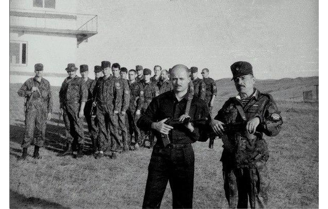 На фото — підрозділ УНСО прибув у зону бойових дій. На передньому плані — сотник УНСО Валерій Бобрович-Устим (праворуч, у польовому однострої) і відпоручник від Проводу УНА-УНСО, народний депутат України Юрій Тима (ліворуч, у чорній сорочці і чорних брюках). Абхазія, літо 1997.